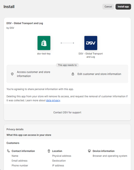 Request your Shopify DSV app user via the DSV Support team (developer.support@dsv.com) – please include the following details:
